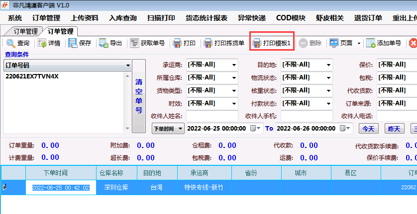 1、订单管理界面=>选中要打印的订单=>按“打印”